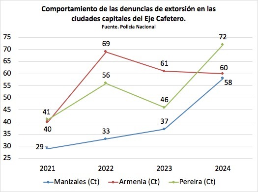 El equipo de prensa de Fajardo le envió a Chequeo Región Eje Cafetero una imagen con cifras de extorsión de la Policía Nacional en el Eje Cafetero entre el 2020 y 2024. “Lo único que se puede ver es una creciente denuncia especialmente en Pereira y Manizales, pero esas cifras tienen un altísimo subregistro”, indicaron y agregaron que la Policía no está entregando cifras de 2025 de ninguna de las tres ciudades del Eje.